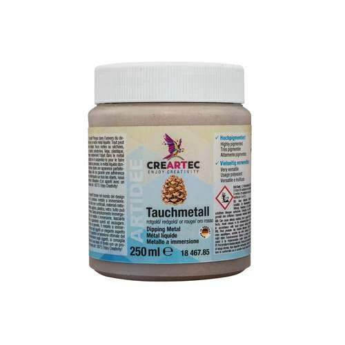 This Creartec Dipping Metal is a thin, flowing metal dispersion, mixed with microfine brass, copper or silver particles. You can immerse objects directly in the immersion medium or, alternatively, apply the medium in multiple layers with a brush. It dries completely within 40 – 60 minutes and immediately shows its metallic sheen.