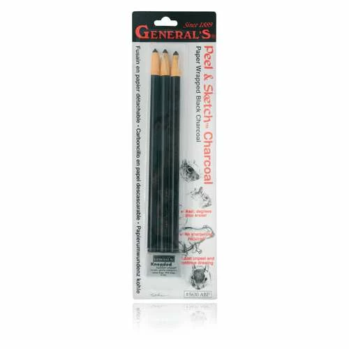 This General’s Peel & Sketch Charcoal Pencil Pack contains 3 handy charcoal sticks which eliminate the need for messy sharpening, plus a kneadable eraser