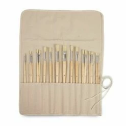 The Gerstaecker Bristle Brush Roll contains 18 bristle brushes in a cotton holder. The holder has 12 individual pockets and measures 55x40cm opened flat and 34x7cm when rolled up. The roll has a cotton tie fastener.