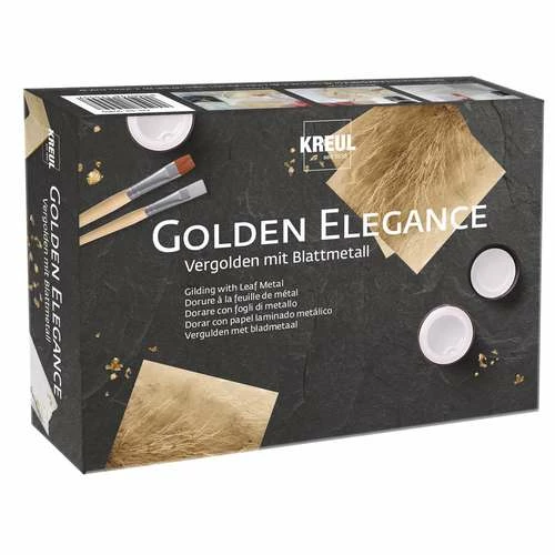 Golden shine turns favourite pieces into something unique. The KREUL Golden Elegance Set makes it easy. The complete set contains everything you need to gild decorative objects. Ideal for absorbent and porous surfaces, such as wood, paper, canvas, cardboard, polystyrene, plastic, ceramics, porcelain, glass, concrete, terracotta, leather, etc.