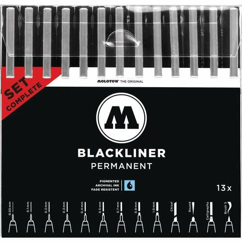 The Molotow Blackliner Permanent Complete Set is now available with all 13 tips in one box. Blackliner pens are ideal for sketching, for school, for outlines and as a fineliner.