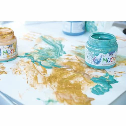 This Mucki Gleaming Finger Paint Set contains 4 bright, water-based paints for children from two years of age. The colours have good coverage and a creamy, pasty consistency for optimal use with fingers and hands.