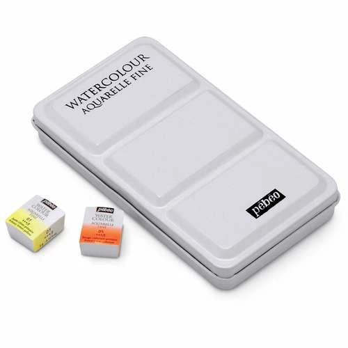 This Pébéo Fine Watercolour Set contains an excellent selection of 12 x 1/2 pans of watercolour paints, which meet the highest demands of the hobby artist. They are delivered in a high-quality, practical white metal box.