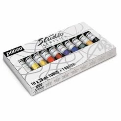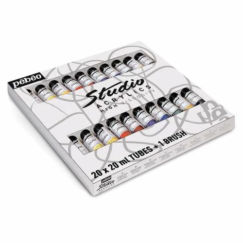 Pébéo Studio Acrylic Sets each contain 20ml tubes and a flat bristle brush size 6. Pébéo Studio Acrylic Paints are suitable for canvas, wood, cement, metal etc.