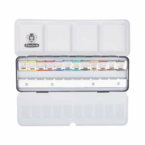 Schmincke Horadam Half-Pan Watercolour Sets contain half-pans in stylish black metal boxes with white interiors. The boxes have thumb rings, a folding palette and mixing wells in the lids.