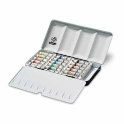 The 12 tube set (29726) contains: lemon yellow, cadmium yellow light, cadmium red light, permanent carmine, ultramarine finest, Prussian blue, phthalo green, permanent olive green, yellow ochre, English venetian red, sepia brown and ivory black.