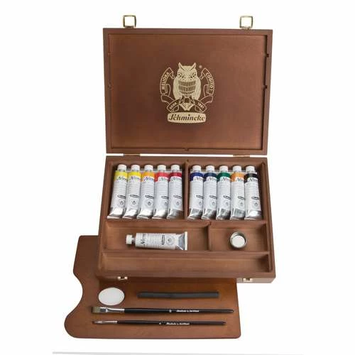 Schmincke Norma deluxe 10-tube oil colour box set, presented in a wooden box and containing 35ml tubes of paint, 1 60ml bottle of odourless thinner, 1 charcoal, 1 mixing bowl, and size 4 and size 10 oil and acrylic brushes.