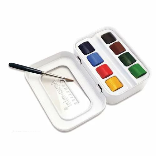 The high quality Sennelier Mini Aqua Box contains 8 half pans of Sennelier watercolour and a small brush in a practical, metal box with integrated palette.