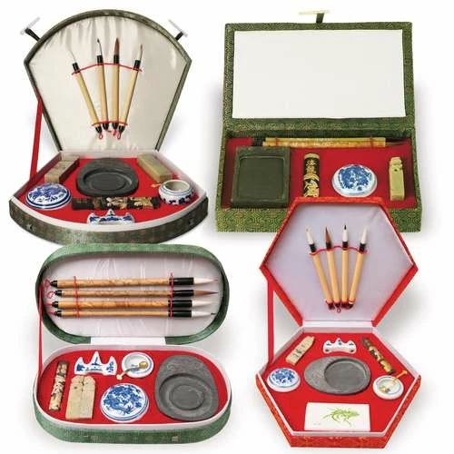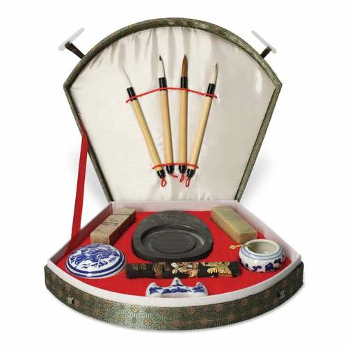 - 1 inkstone, 1 black ink stick, 2 brushes, 1 seal stone, 1 colour in a porcelain dish