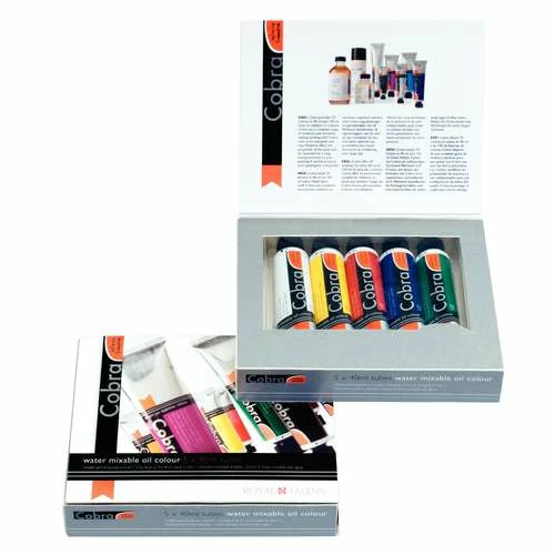 The Royal Talens Cobra 5-tube Water Mixable Oil Colour Set contains 10 x 40ml tubes of fast-drying oil colours, easy to mix and to wash off.